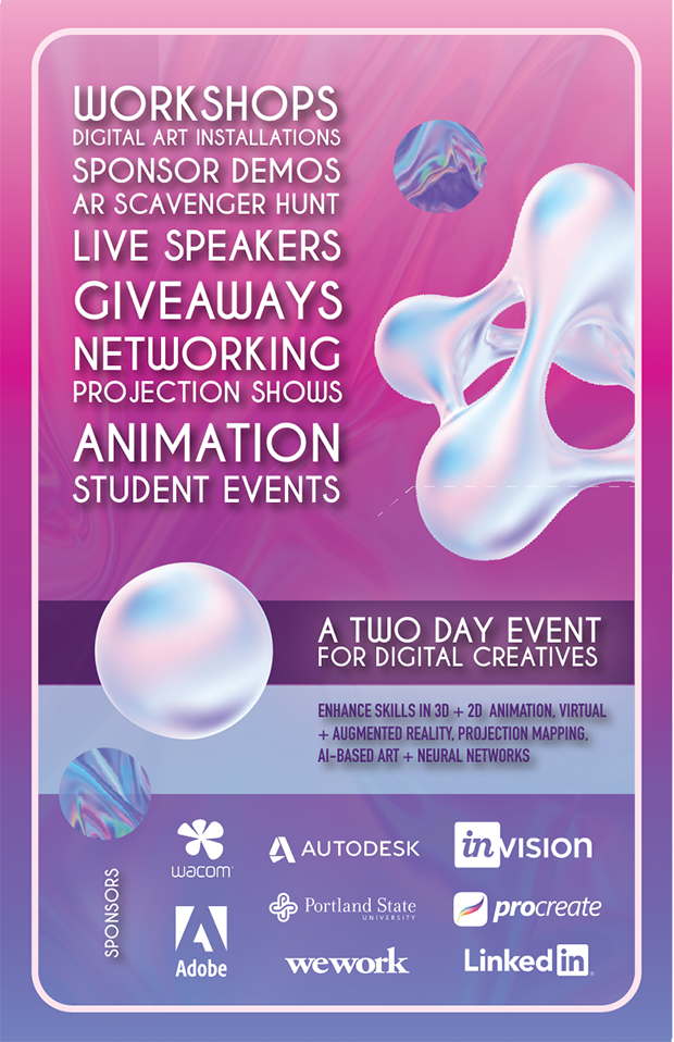 Design in Motion seeks to inspire and merge all levels of digital creatives. Attend workshops and live product demos to learn the latest and greatest from leading design software companies. Explore digital sculptures, projection art shows, and our AR Poster Scavenger Hunt. Network with other professional designers, product speakers, and design students.